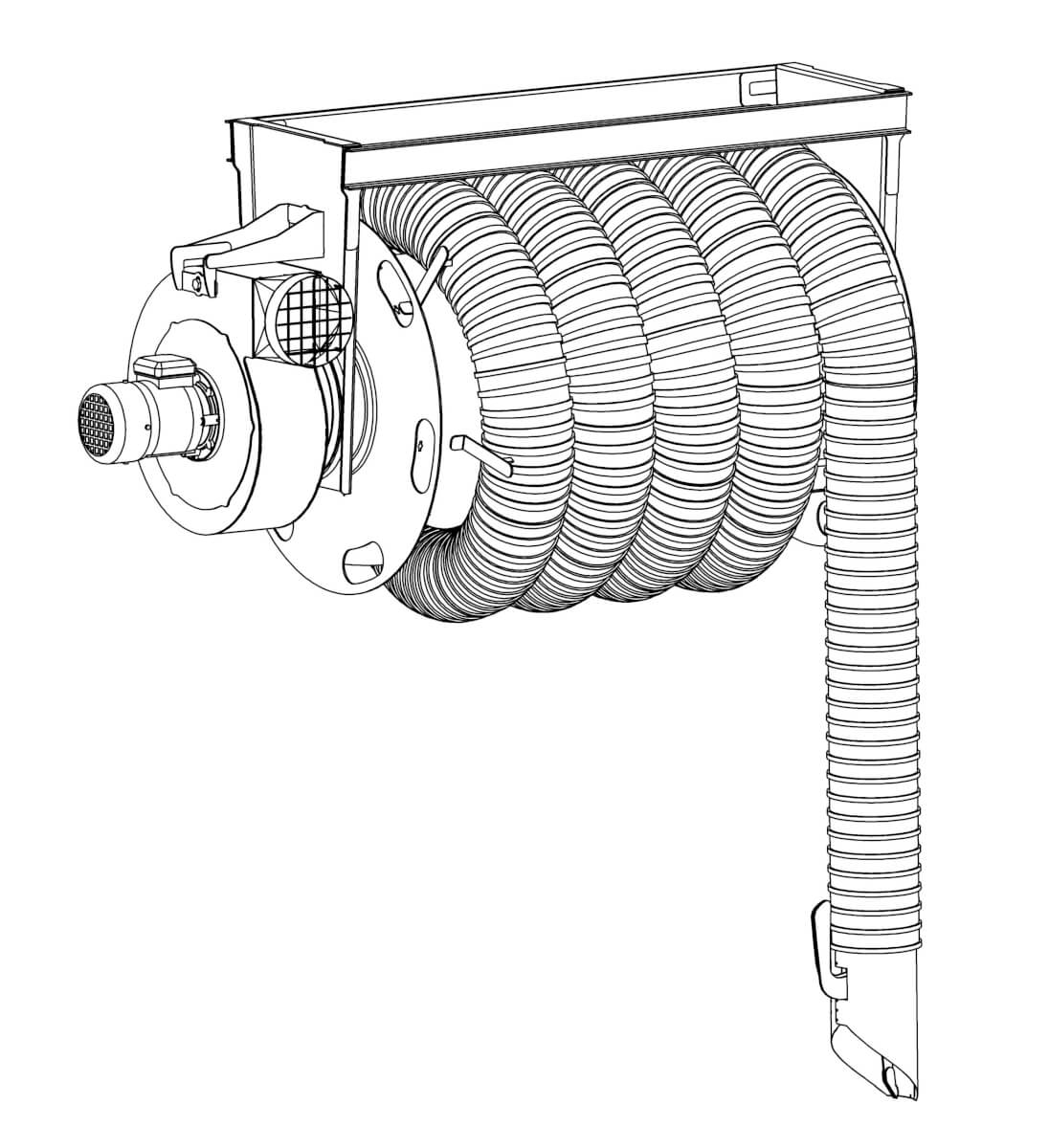 Nawijanie i rozwijanie węża odciągowego realizowane jest przez zabudowany w bębnie nawojowym silnik rurowy, który pełni jednocześnie rolę hamulca. Do sterowania pracą urządzenia (włączanie i wyłączanie wentylatora, nawijanie i rozwijanie węża) przeznaczony jest zespół elektryczny, który podczas instalacji urządzenia mocuje się w dogodnym dla użytkownika miejscu.