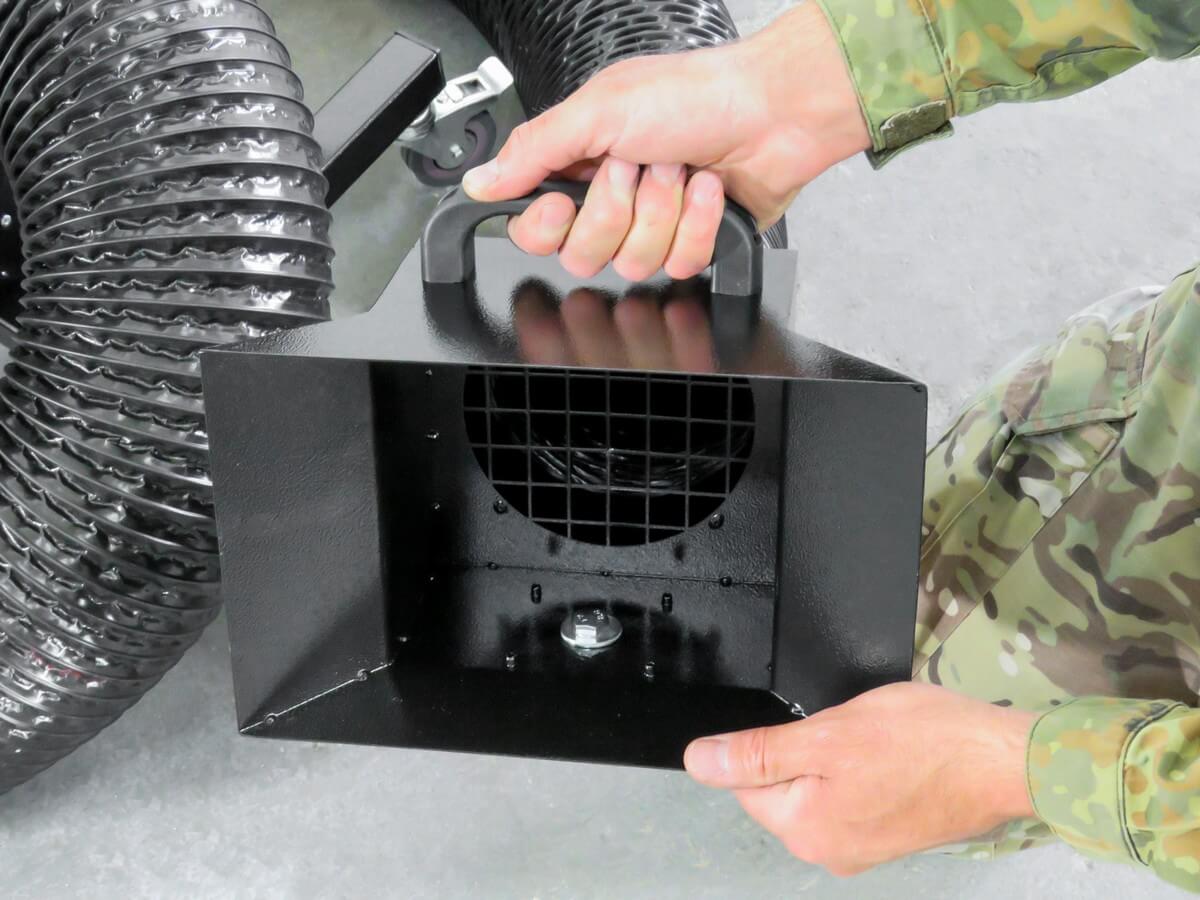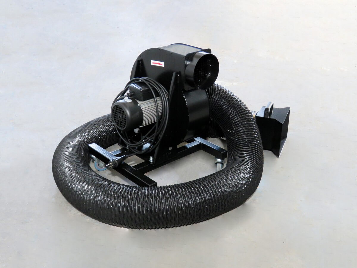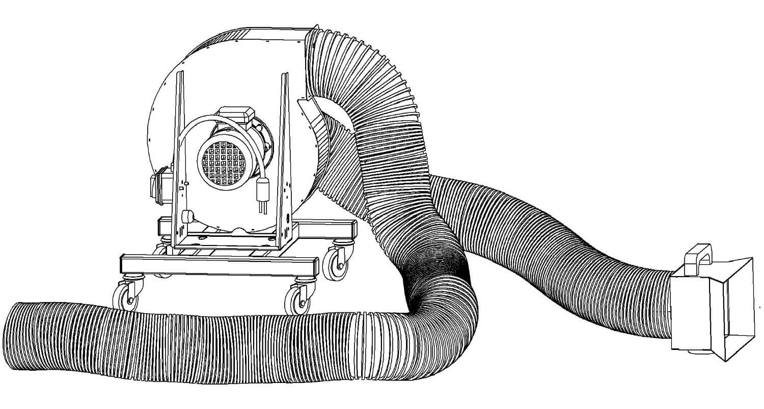 Mobilny Zestaw Odciągowy MZO-55 składa się z wentylatora promieniowego umieszczonego na ramie nośnej wyposażonej w koła jezdne, elastycznego węża typu ST o średnicy 160mm i długości 10mb, ssawki magnetycznej o wymiarach wlotu 195x300mm oraz zestawu obejm. Urządzenie wyposażone jest we włącznik umieszony na obudowie wentylatora oraz kabel zasilający zakończony wtykiem.