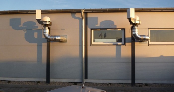 W celu ochrony przez wpływem czynników atmosferycznych wentylator wyposażony jest w aluminiową osłonę silnika a dla zminimalizowania emitowanego do otoczenia szumu na wylocie powietrza zastosowano tłumik hałasu. Tłumik hałasu standardowo jest montowany w pozycji poziomej a po zastosowaniu kolana KT(opcja) w pozycji pionowej.